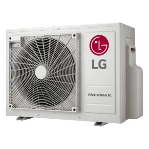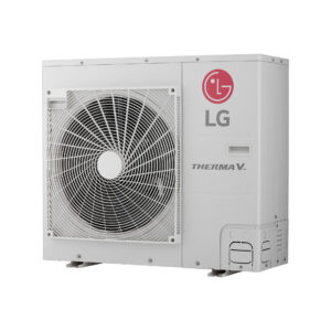 Tepelná čerpadla LG Therma V Split R32 S v klasickém designu venkovní jednotky s jedním ventilátorem a světlé šedé barvě byla zkonstruována pro spolehlivý, tichý a úsporný provoz s vysokou účinností při využití chladiva R32 pro zajištění vytápění nebo chlazení rodinných domů a ohřev teplé vody.